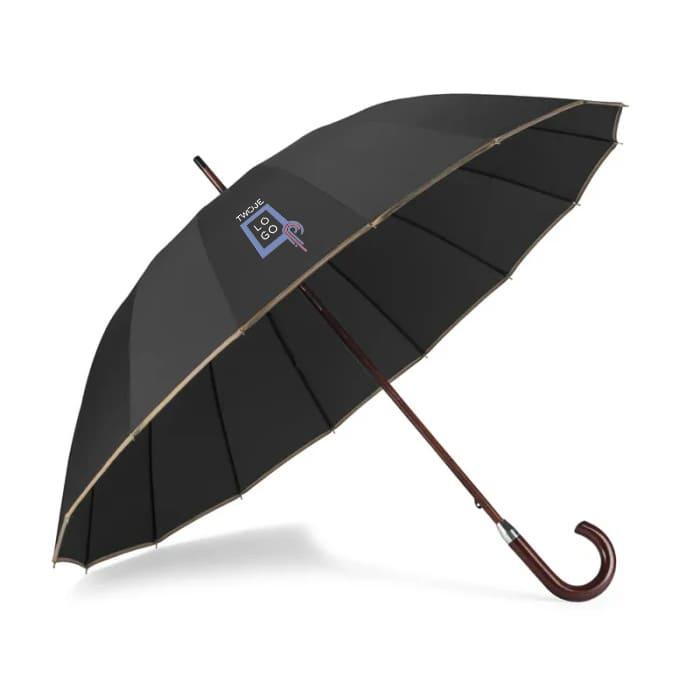 Bardzo elegancki parasol manualny, szesnasto panelowy, zakończony drewnianą zakrzywioną rączką. Wykonany z materiału typu pongee 190 T. Śr czaszy po rozłożeniu to 112 cm, długość złożonego parasola to 90 cm. Szerokość panelu wynosi 22 cm. Nadruk logo wykonamy na czaszy parasola metodą sitodruku.