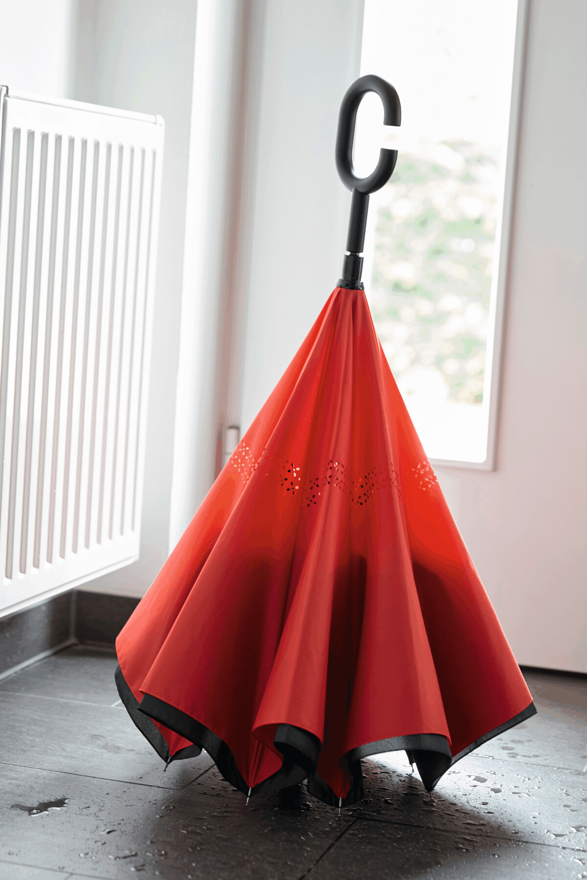 Parasol FLIPPED odwrotnie otwierany, z automatycznym mechanizmem zamykającym, z zabezpieczeniem, z uchwytem w kształcie litery C, dzięki któremu dłonie pozostają wolne, z podwójną, wentylowaną powłoką, metalową laską, szynami z włókna szklanego, metalowymi kolcami. Poszycie z poliestru-pongee, zapinany na rzep.