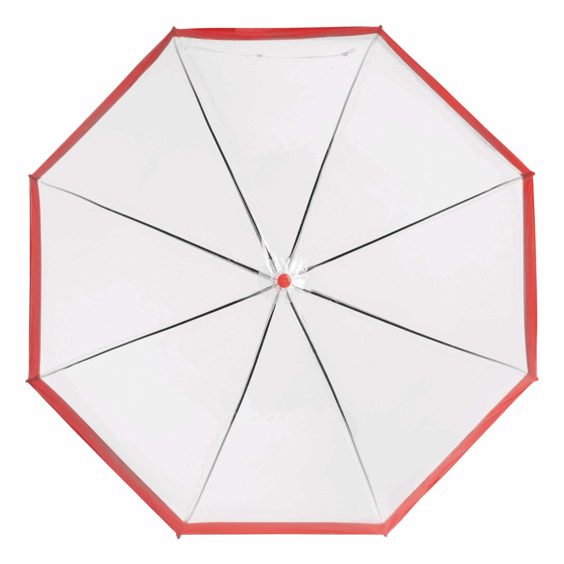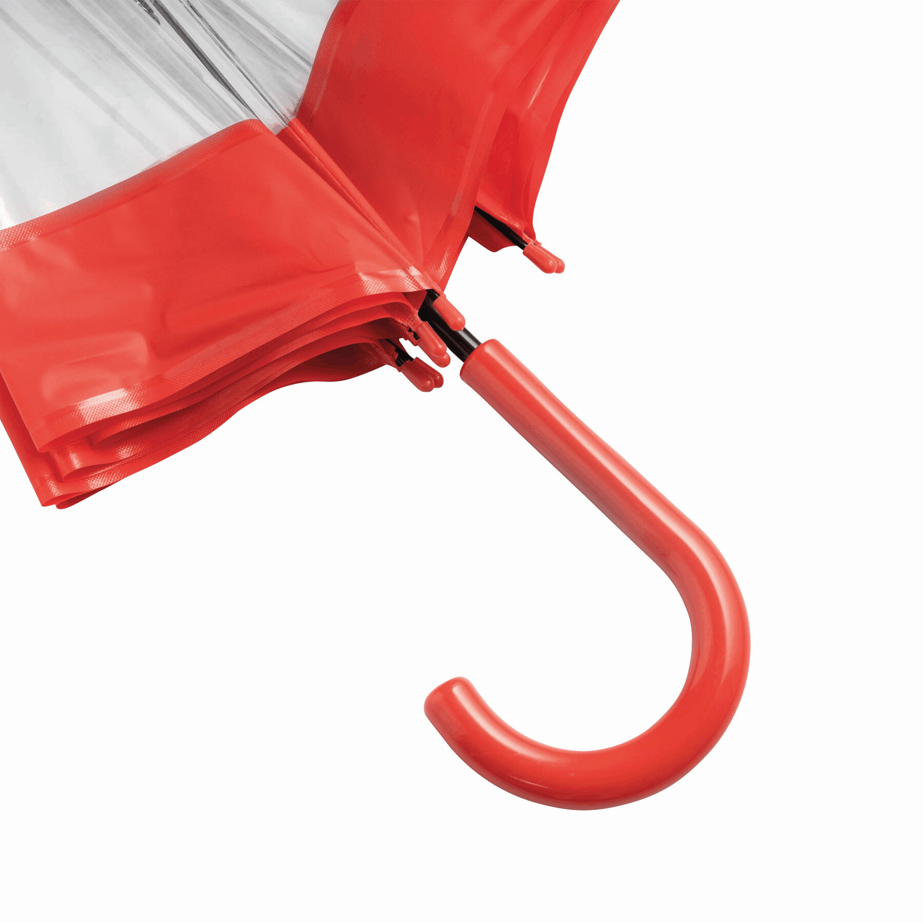 Parasol HONEYMOON z zaokrąglonym, plastikowym uchwytem, z metalową laską i szynami, plastikowe kolce. Poszycie z transparentnej folii POE z kolorową obwódką i paskiem spinającym zapinanym na zatrzask