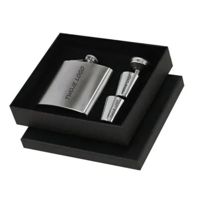 Piersiówka 175 ml w zestawie z 2 kieliszkami i lejkiem, produkt wykonany ze stali nierdzewnej z recyklingu