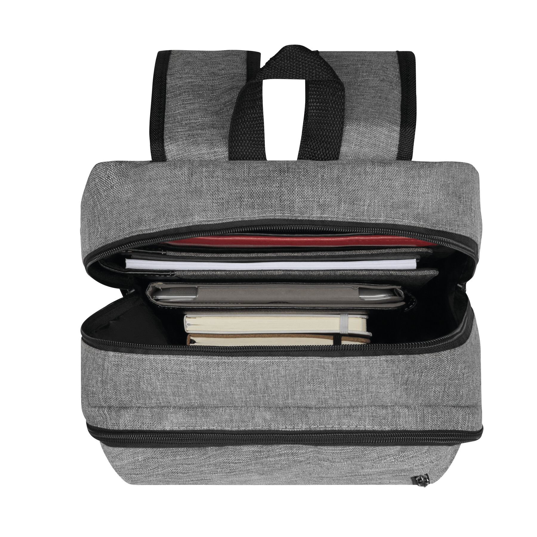 Plecak DONEGAL z pionową główną kieszenią na zamek błyskawiczny, jedna przestronna komora główna i jedna wyściełana przegroda na laptopa, uchwyt do przenoszenia, wyściełane szalki na ramię i tylna ścianka.