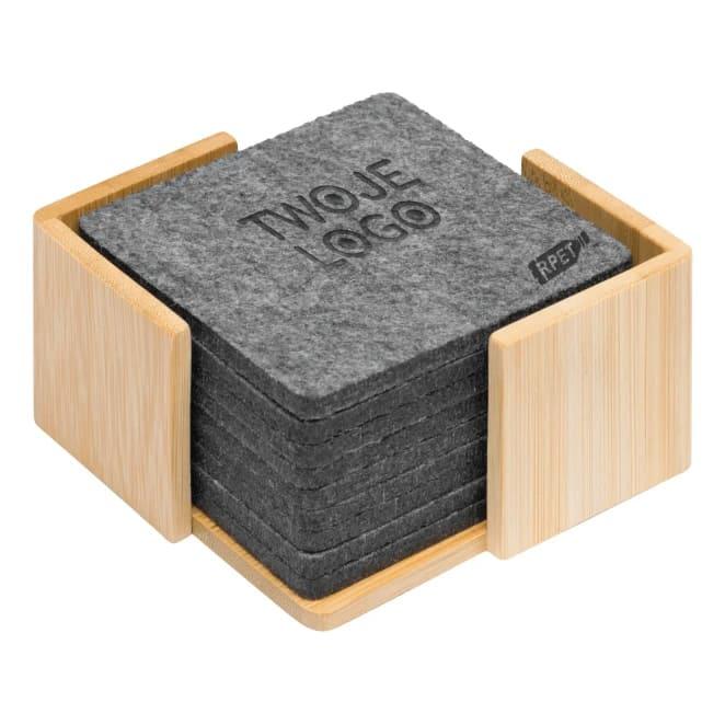 Podkładki filcowe ECO BASE: 10 podstawek pod drinki wykonanych z filcu RPET w praktycznym bambusowym podajniku.