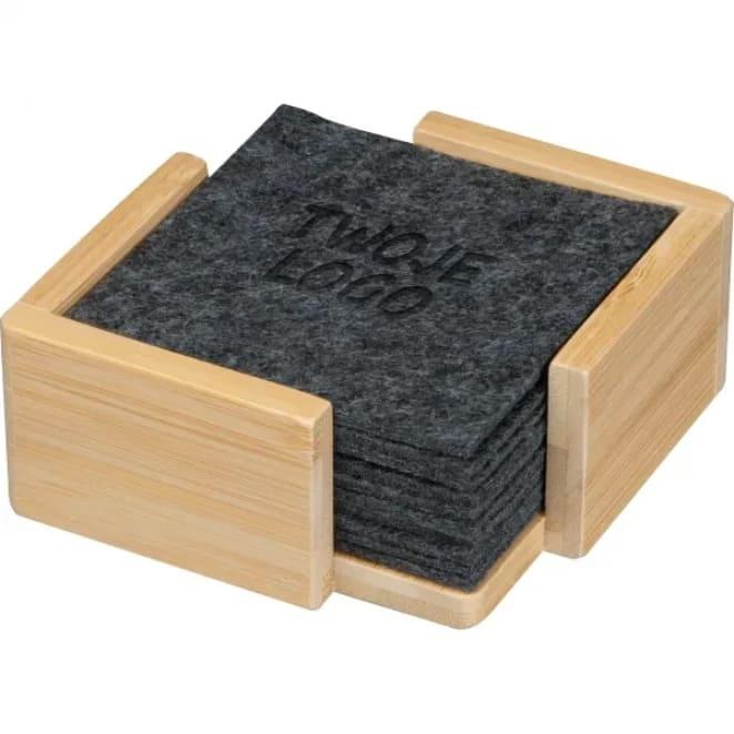 10 szt. podkładek pod kubek wykonanych z filcu pochodzącego z recyklingu. Podkładki umieszczone w dekoracyjnym bambusowym stojaku.