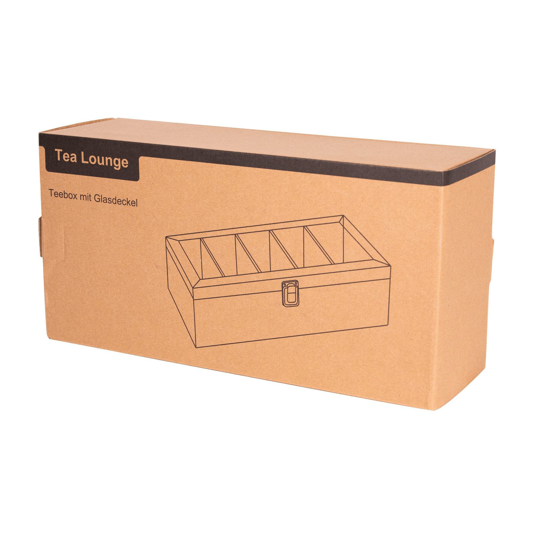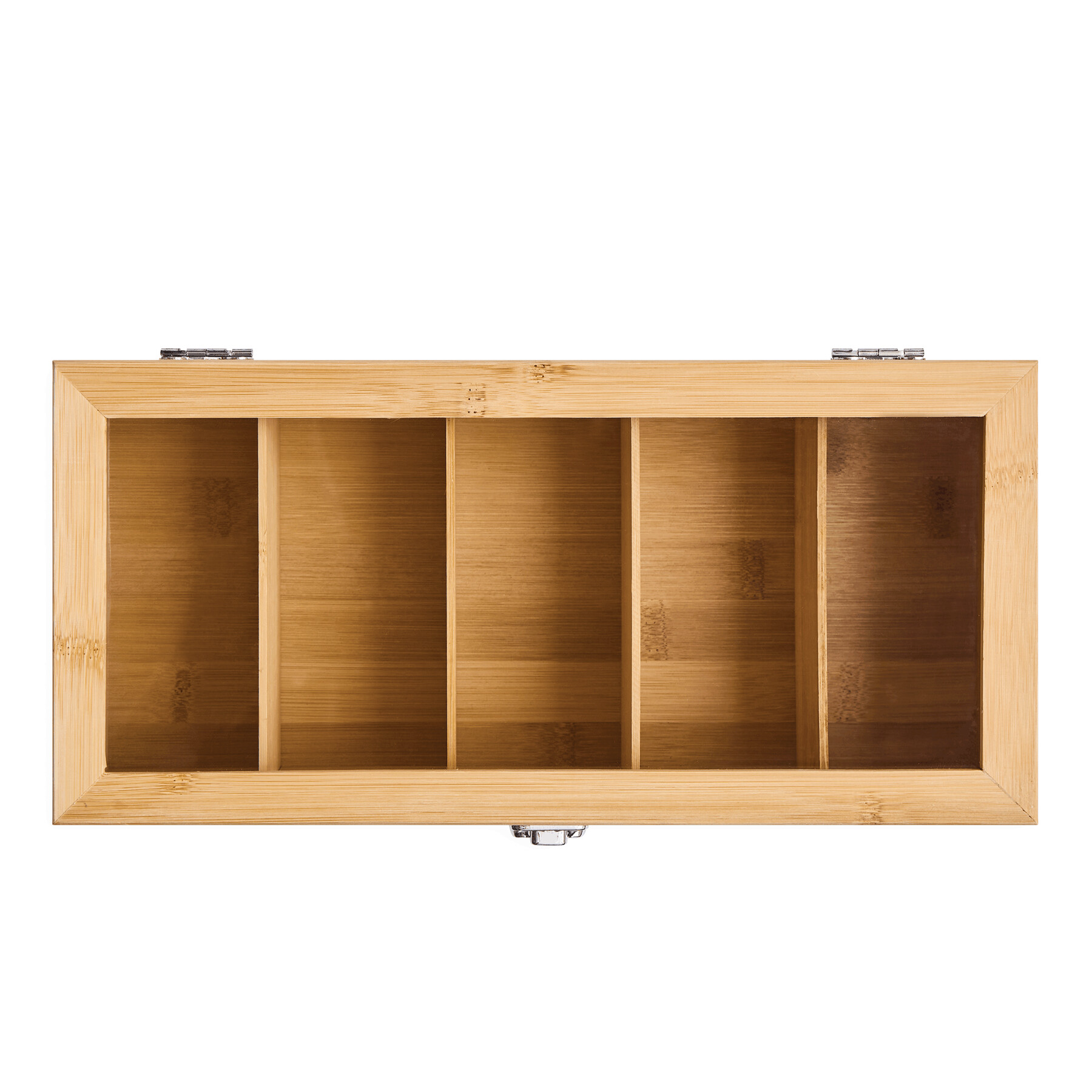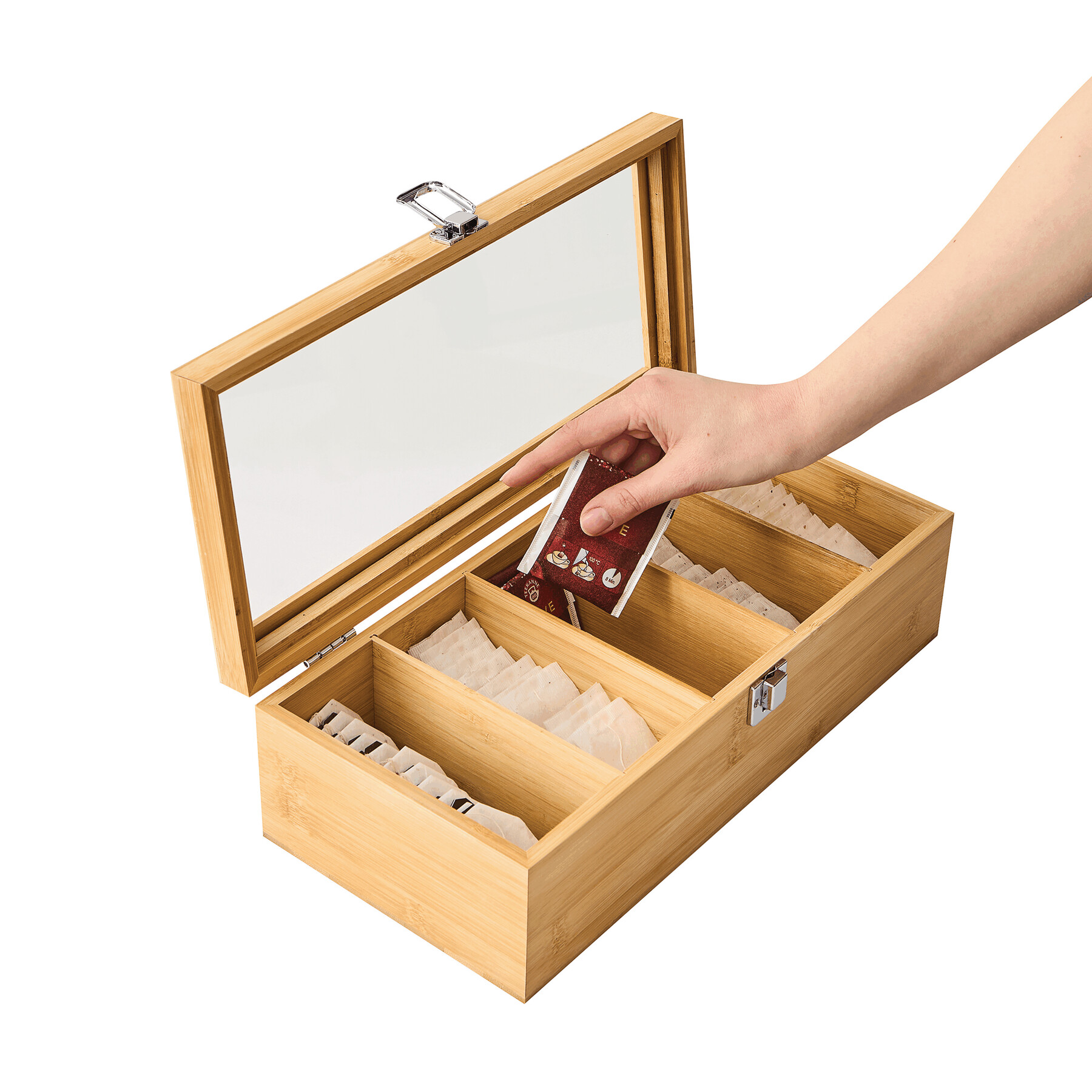 Pojemnik na herbatę TEA LOUNGE z 5 oddzielnymi przegródkami na torebki z herbatą, ze szklaną pokrywką i zatrzaskiem, wykonany z bambusa.