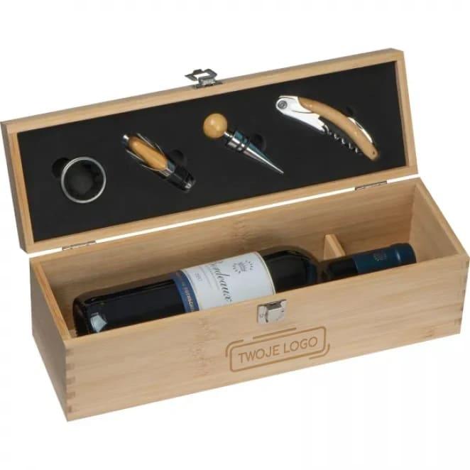 Elegancka, drewniana skrzynka na wino w której znajdziesz wszystkie najpotrzebniejsze przybory barmańskie - otwieracz do butelek, korek, nalewak i pierścień.