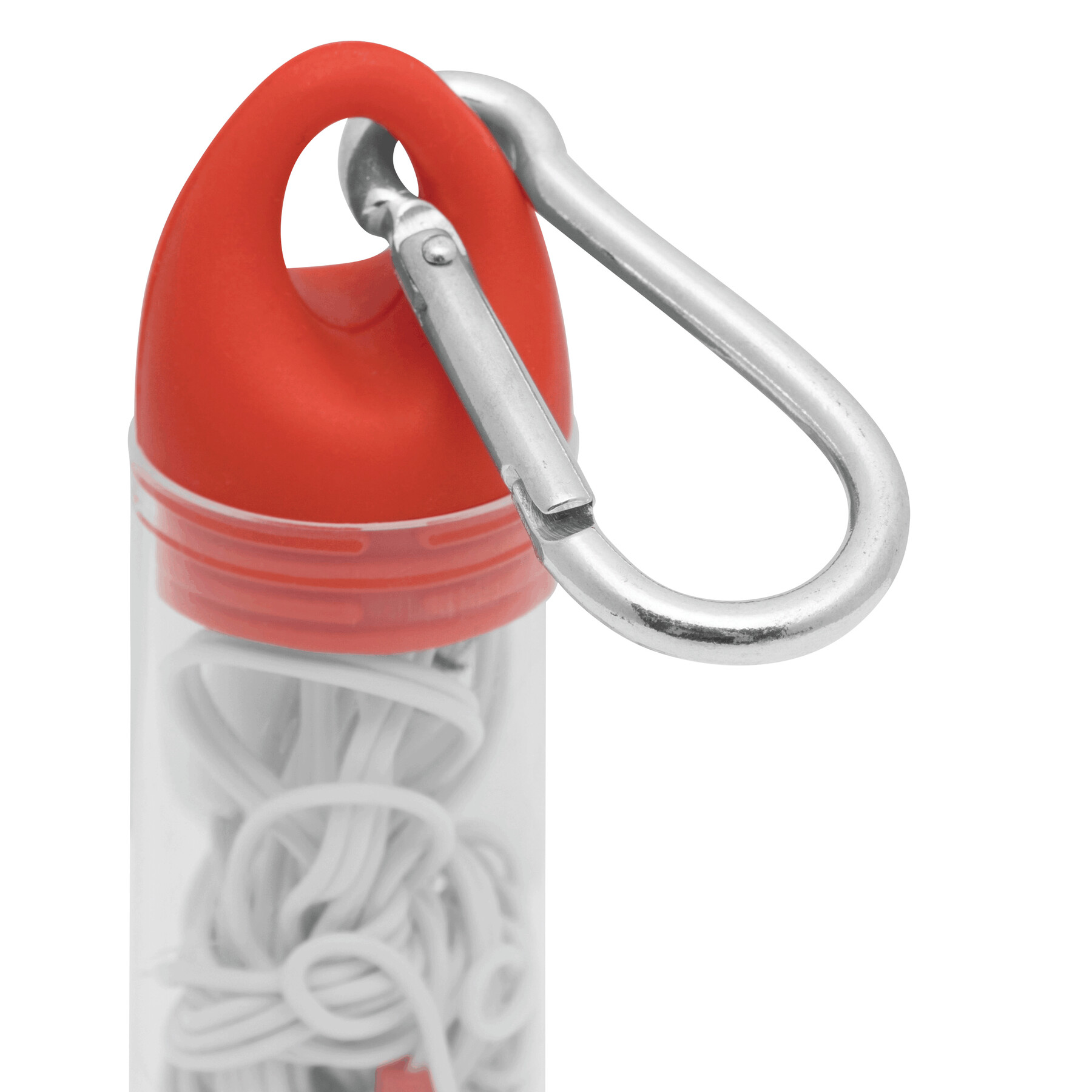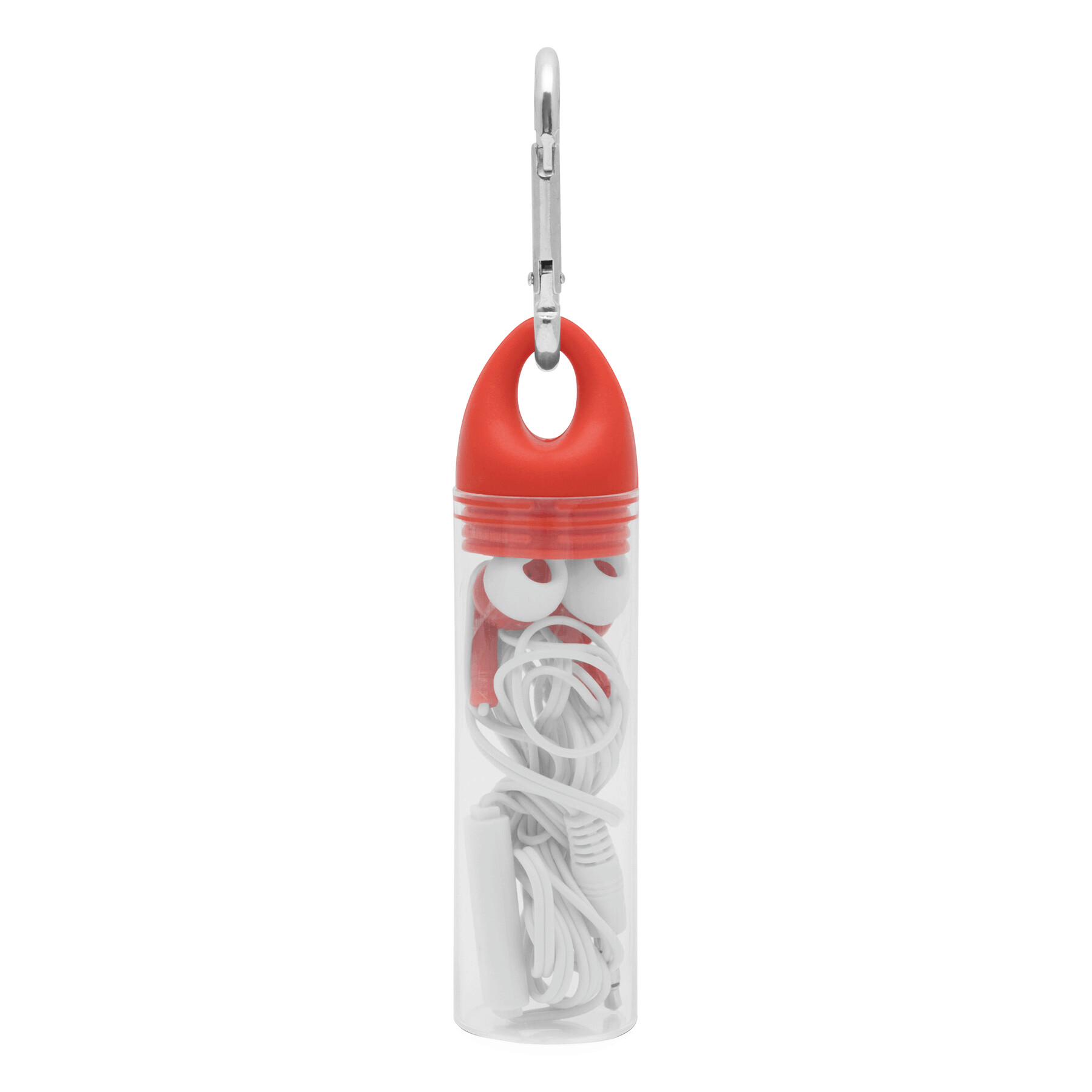 Słuchawki douszne LISTEN & TALK ze zintegrowanym mikrofonem i przyciskiem do odbierania połączeń, 3,5 mm wtyczka jack, długość przewodu ok. 120 cm, w plastikowej obudowie z dopasowanym, kolorowym zamknięciem i aluminiowym karabińczykiem.
