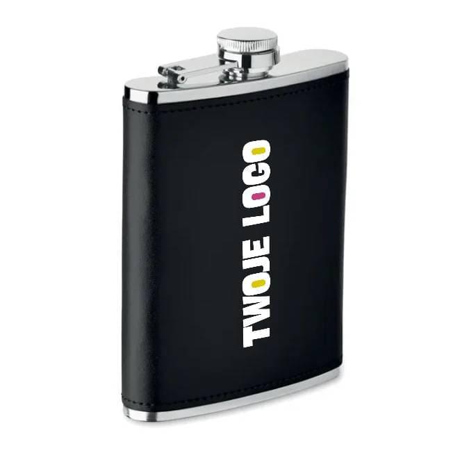 Smukła piersiówka ze stali nierdzewnej z pokrowcem ze skóry PU. pojemność 200 ml.