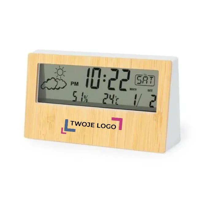 Stacja pogodowa, zegar, temperatura, wilgotność powietrza, kalendarz, alarm, bambusowy front