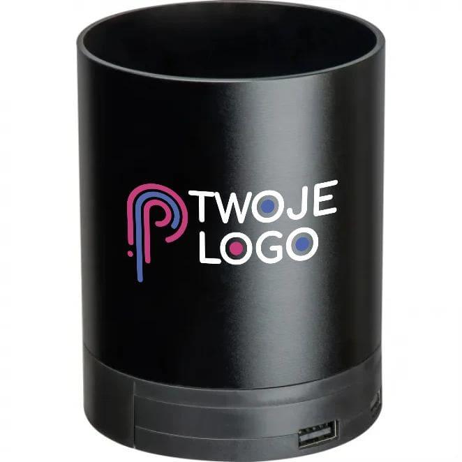 Pojemnik na długopisy, wykonany z aluminium pochodzącego z recyklingu. Produkt wyposażony w bezprzewodową ładowarkę, rozgałęźnik USB oraz podstawkę do telefonu. Kabel do ładowania został dołączony do zestawu.