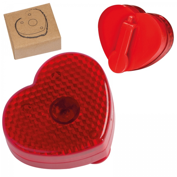 Plastikowe światełko LED w kształcie serca, z klipsem i kółkiem do zaczepiania. Produkt zawiera baterie.
