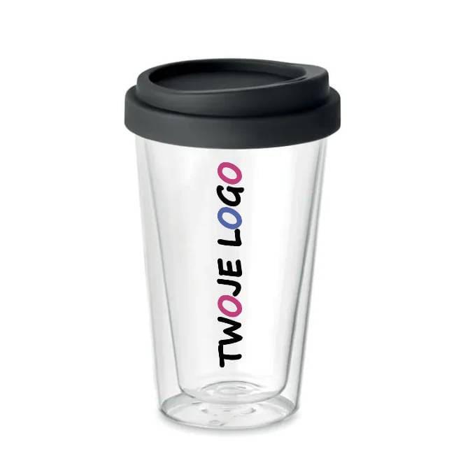 Dwuścienna wysoka szklanka borokrzemowa z silikonową pokrywką. Pojemność 350 ml
