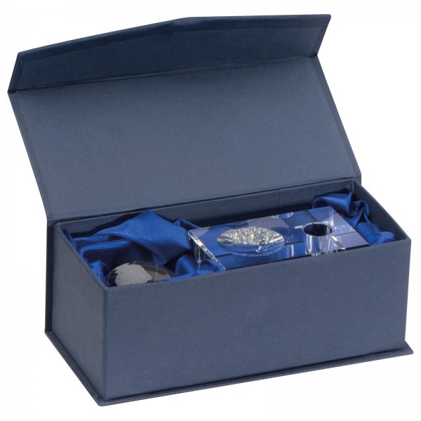 Szklany blok z globusem i z miejscem na długopis. Metodą graweru laserowego można umieścić na nim tekst gratulacji lub życzenia. Zapakowany w ozdobne pudełko wyściełane satyną.