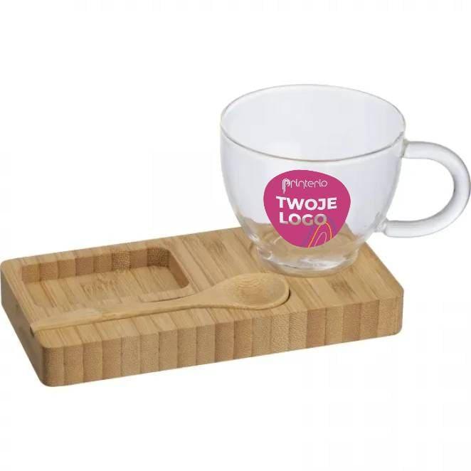 Taca z łyżeczką i szklanym kubkiem 150 ml do nałożenia logo