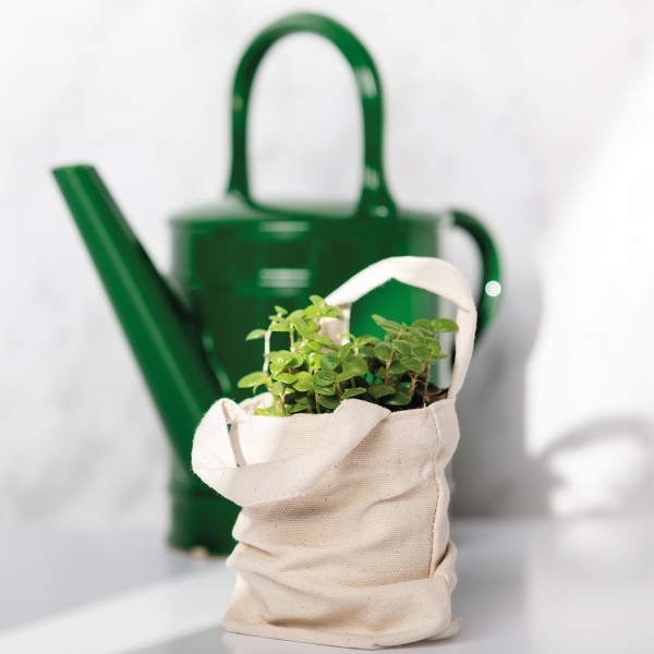Mała torba bawełniana w naturalnym kolorze z krótkimi uszami (12 cm), gramatura 140 g/m². Certyfikat ECO Tex standard 100.