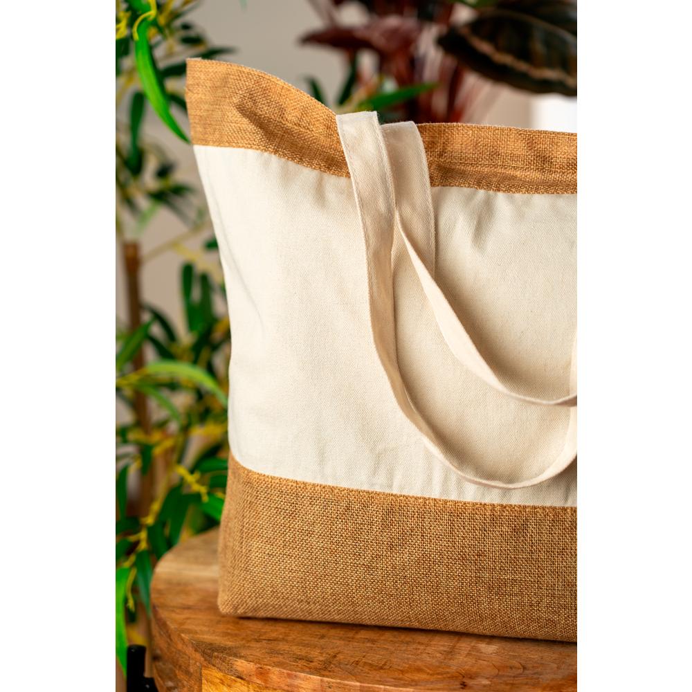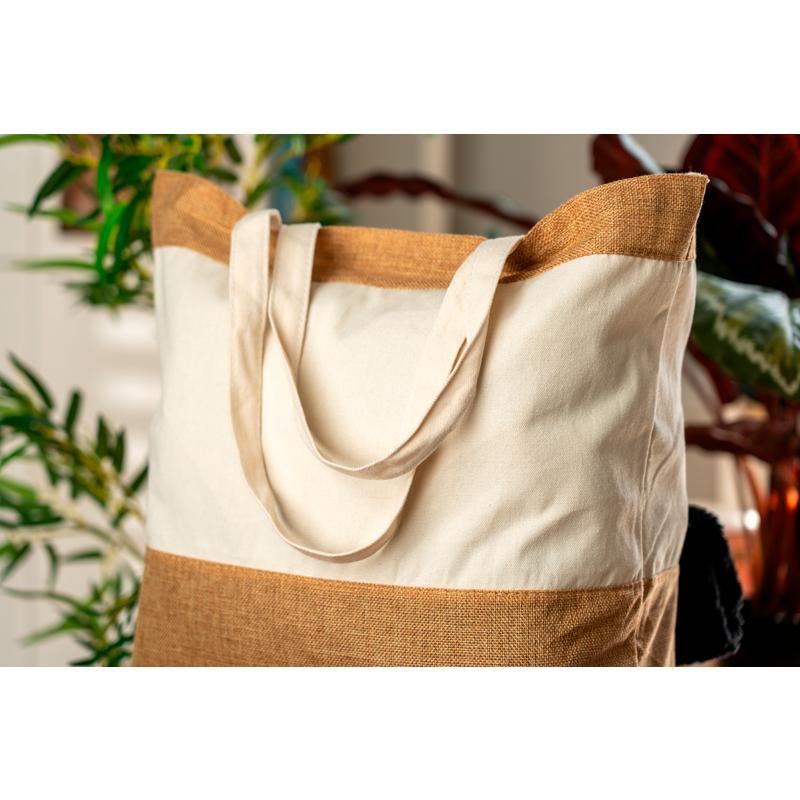 Pojemna torba z długimi uszami, wykonana z bawełny i juty.