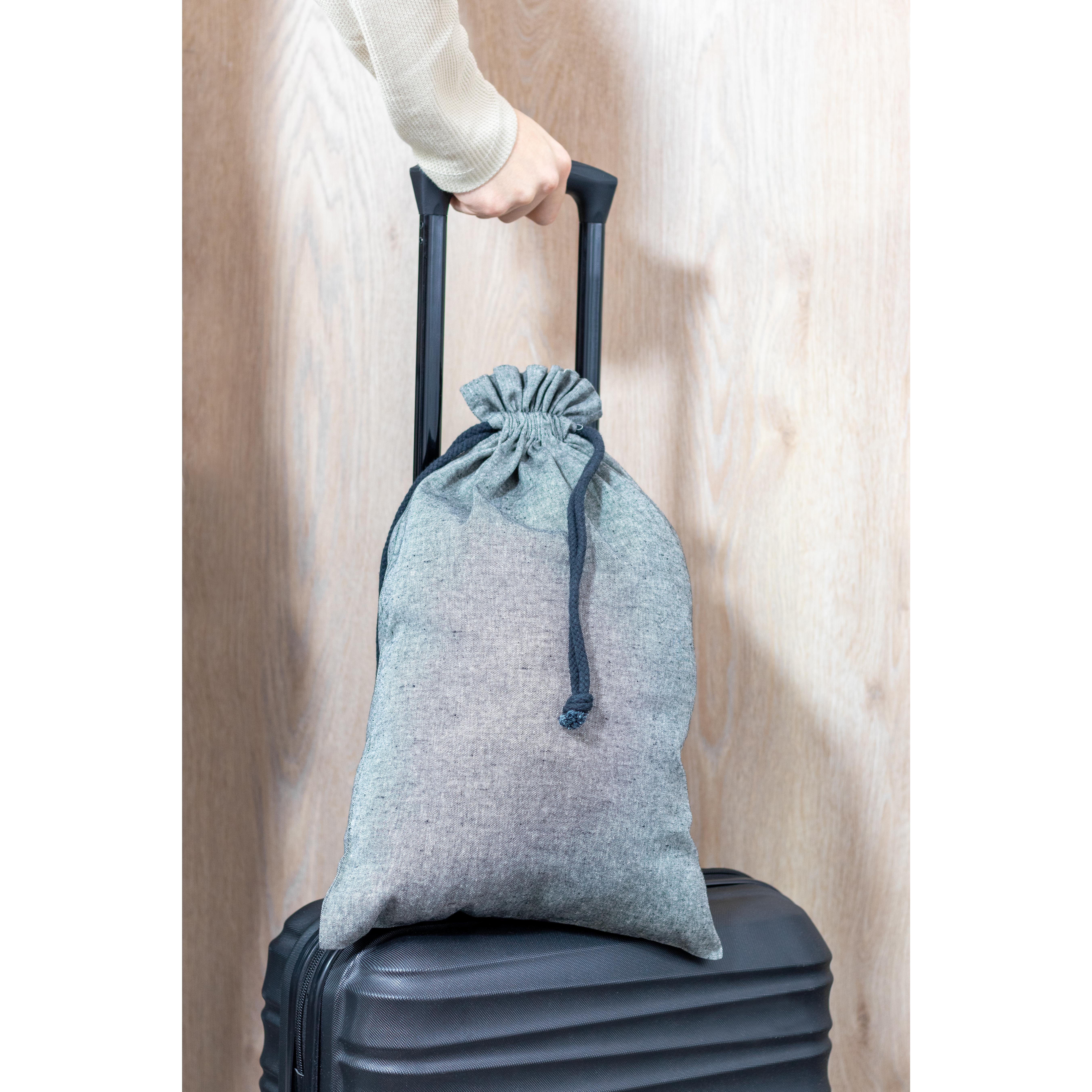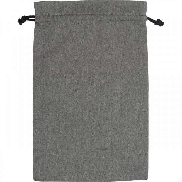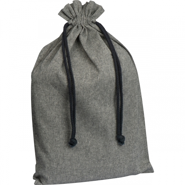 Duży woreczek bawełniany wykonany z bawełny pochodzącej z recyklingu, z certfikatem Oeko-Tex® STANDARD 100, gramatura 110g/m². Woreczek zamykany za pomocą sznureczków ściągających.