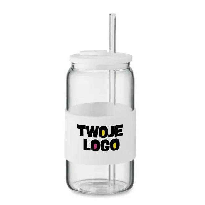 Wysoki kubek ze szkła borokrzemowego z silikonową pokrywką i uchwytem. Zawiera słomkę ze szkła borokrzemowego. Pojemność: 550 ml.
