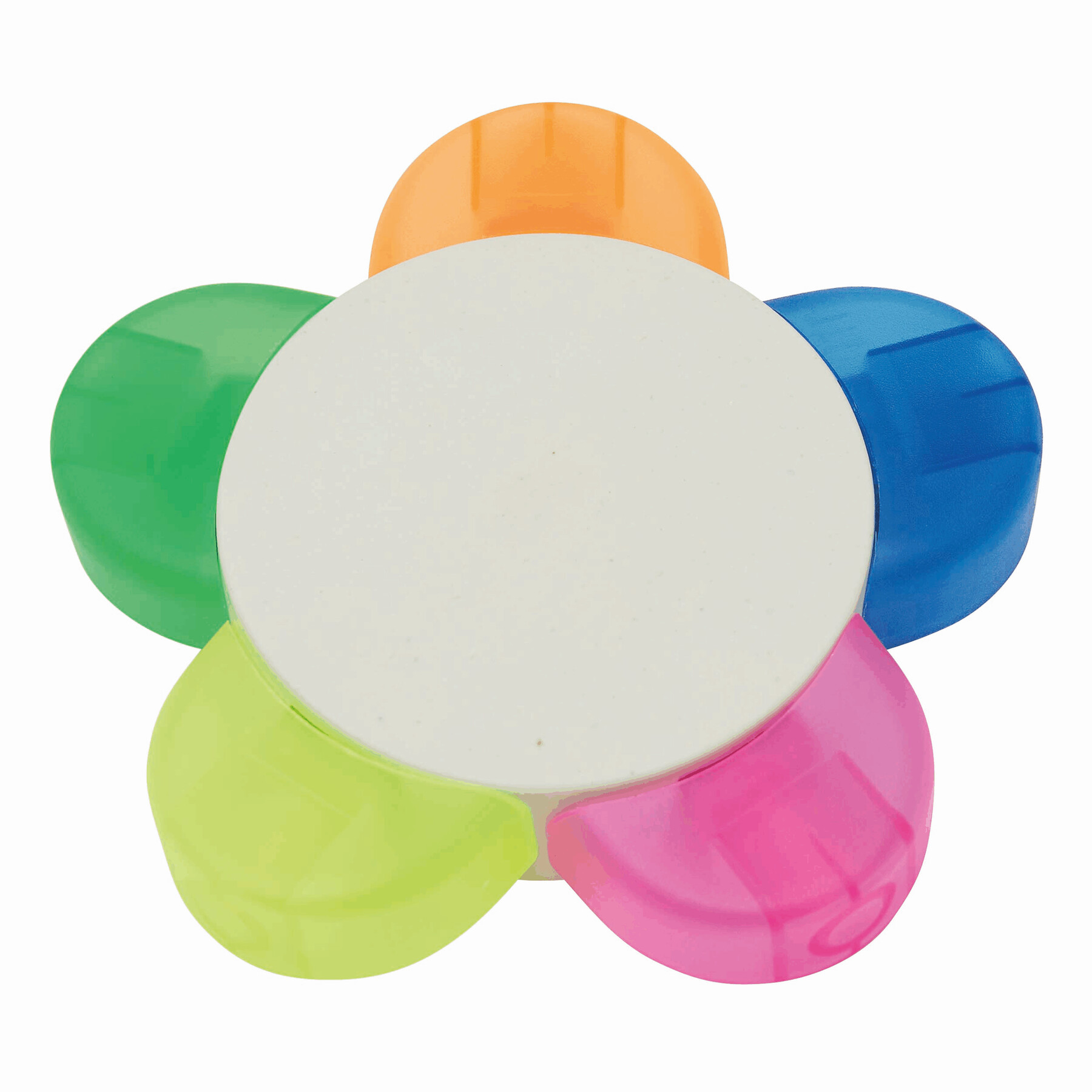Zakreślacz w kształcie kwiatka FLOWER: w 5 kolorach (zielony, pomarańczowy, niebieski, różowy, żółty), wykonany w 30% z kartonów po mleku pochodzących z recyklingu.