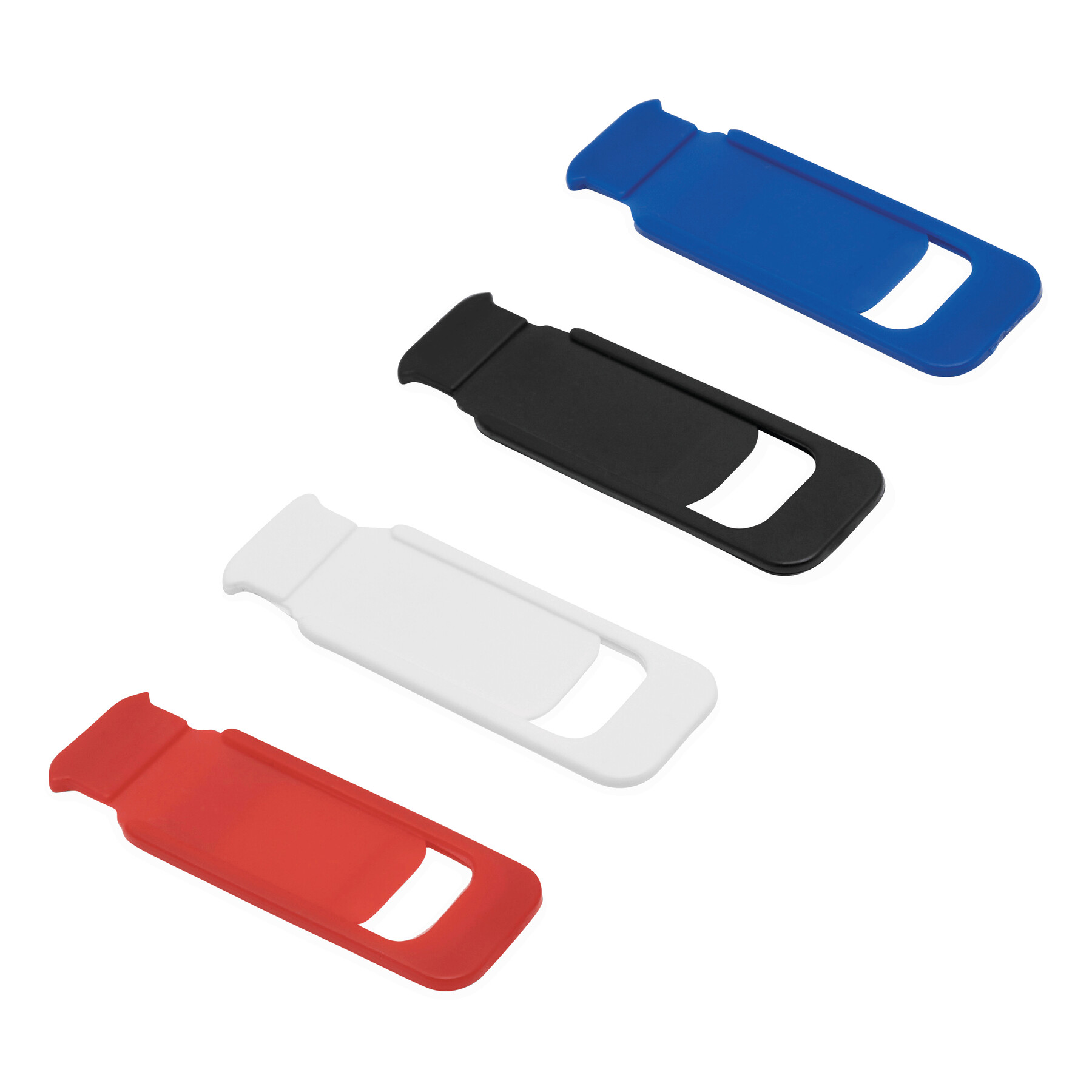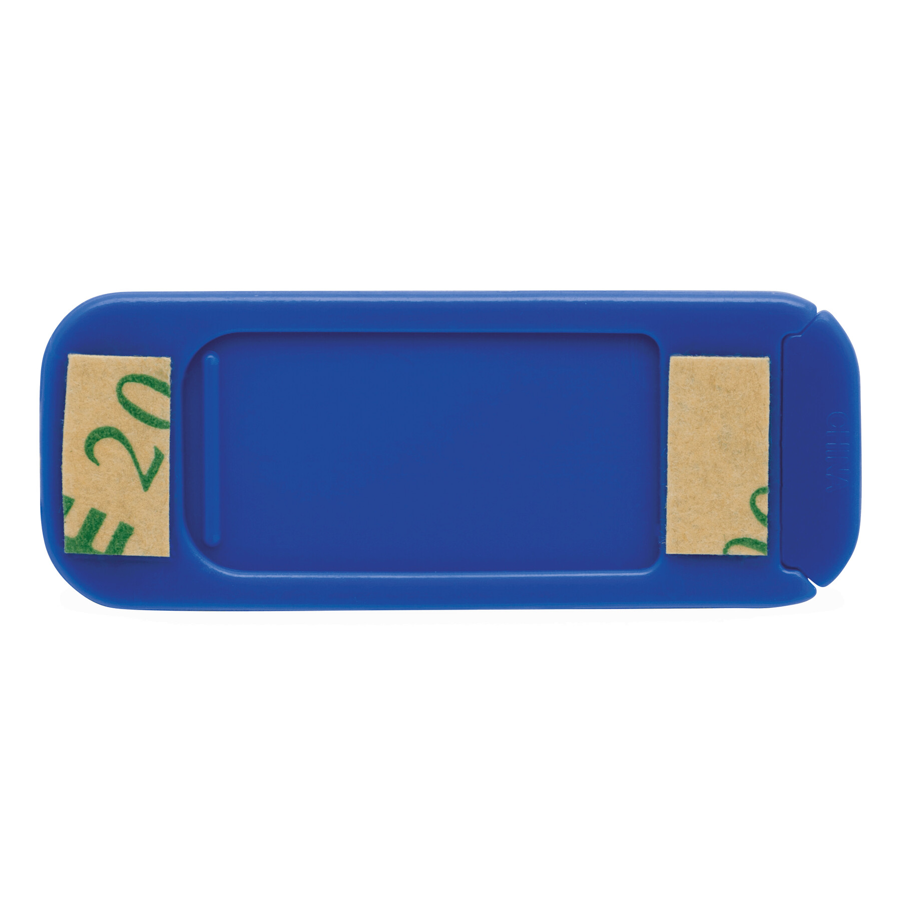 Zasłonka kamery internetowej HIDE z 2 paskami samoprzylepnymi na odwrocie przeznaczonymi do przymocowania do laptopa, łatwe otwieranie i zamykanie za pomocą suwaka.