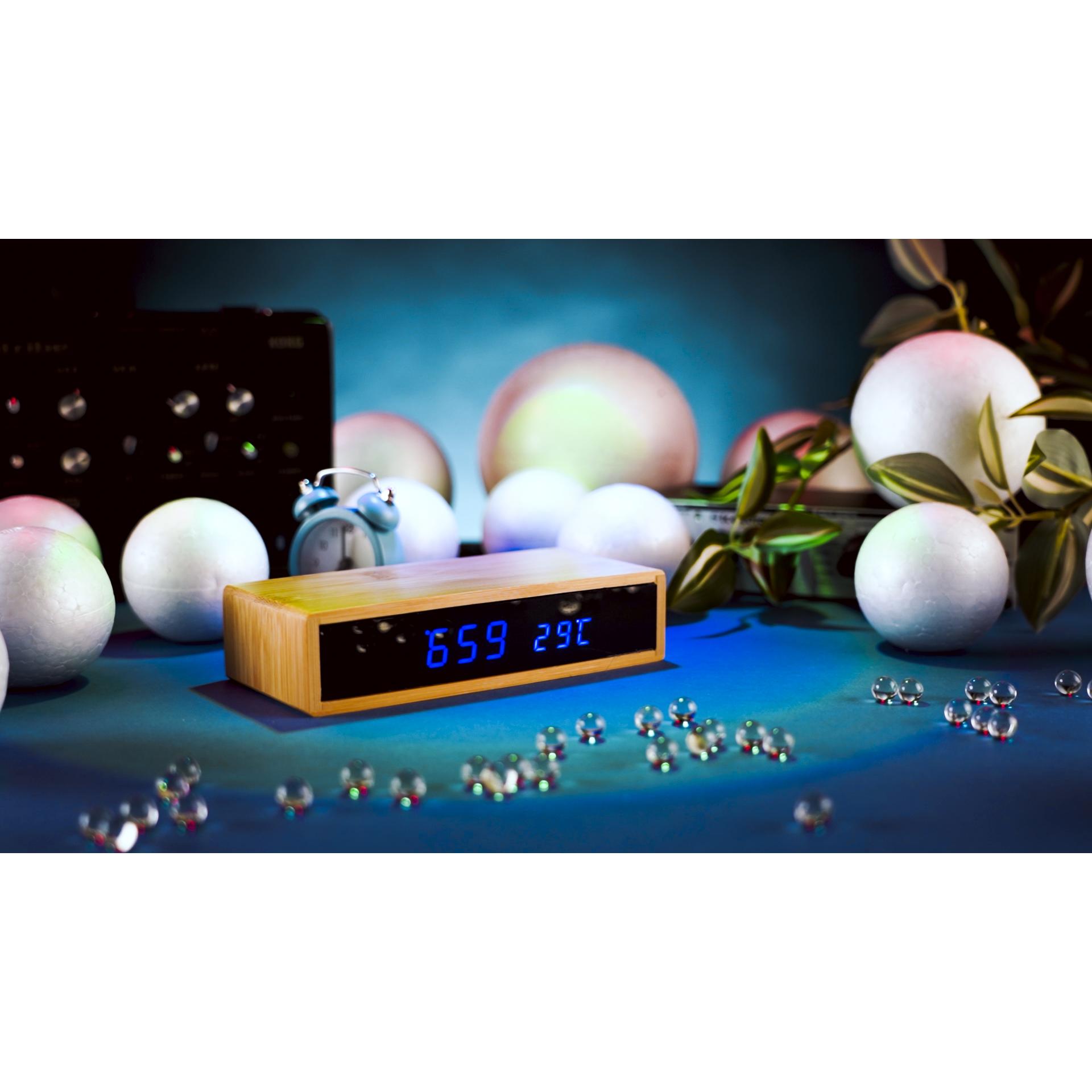 Zegar na biurko, wykonany z bambusa z cyfrowym wyświetlaczem LED pokazującym godzinę oraz temperaturę. Zegarek posiada również funkcję budzika oraz ładowania indukcyjnego.