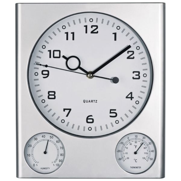 Zegar ścienny wykonany z plastiku i akrylu. Zegar na ścianę posiada białą tarczę i matowo-srebrną obudowę. Dodatkowe funkcje: wyświetlanie wilgotności powietrza i temperatury.