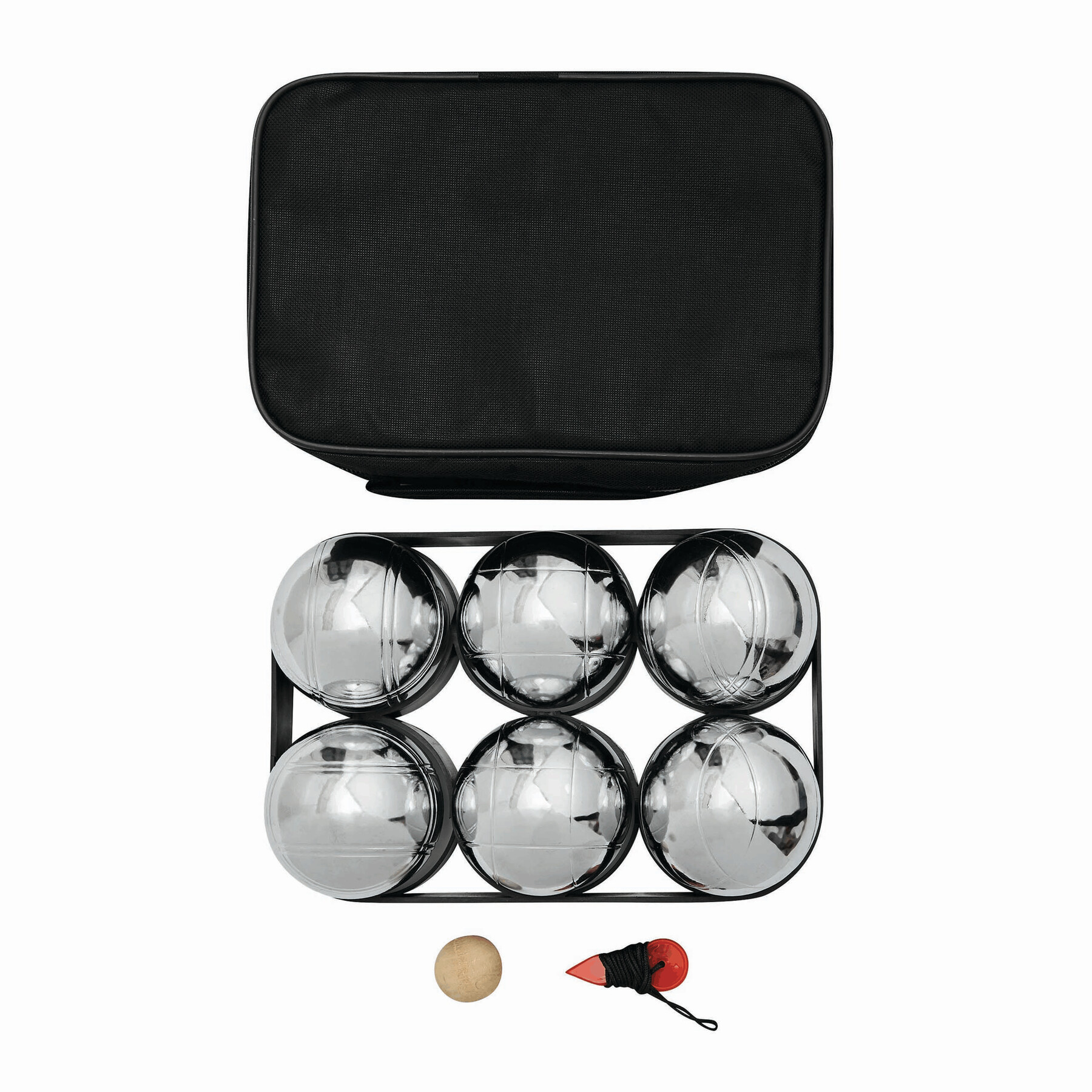 Zestaw do gry w boule GOLIATH składa się z 6 metalowych kul, drewnianej piłeczki i czerwonego sznurka. Pakowany w czarne nylonowe etui z zamkiem.