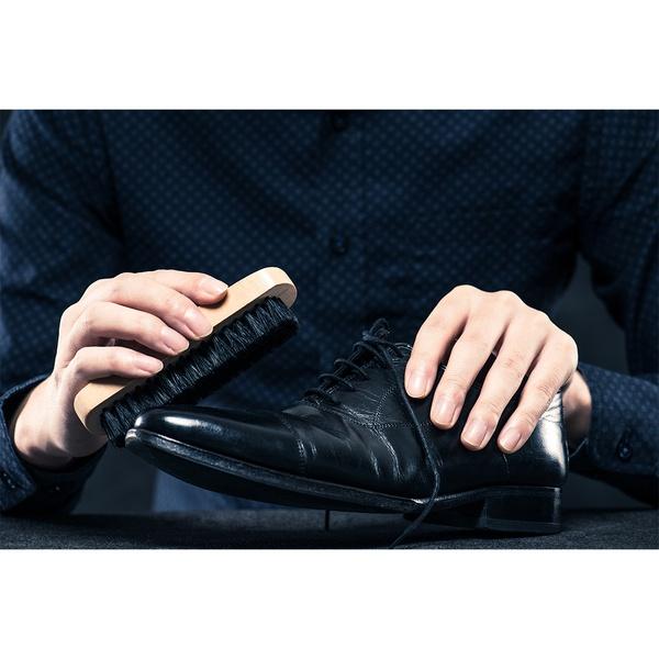 Zestaw do pielęgnacji obuwia w eleganckim etui. Zawiera pastę do butów czarną i bezbarwną, dwie szczotki (twardą i miękką) oraz szmatkę do polerowania.