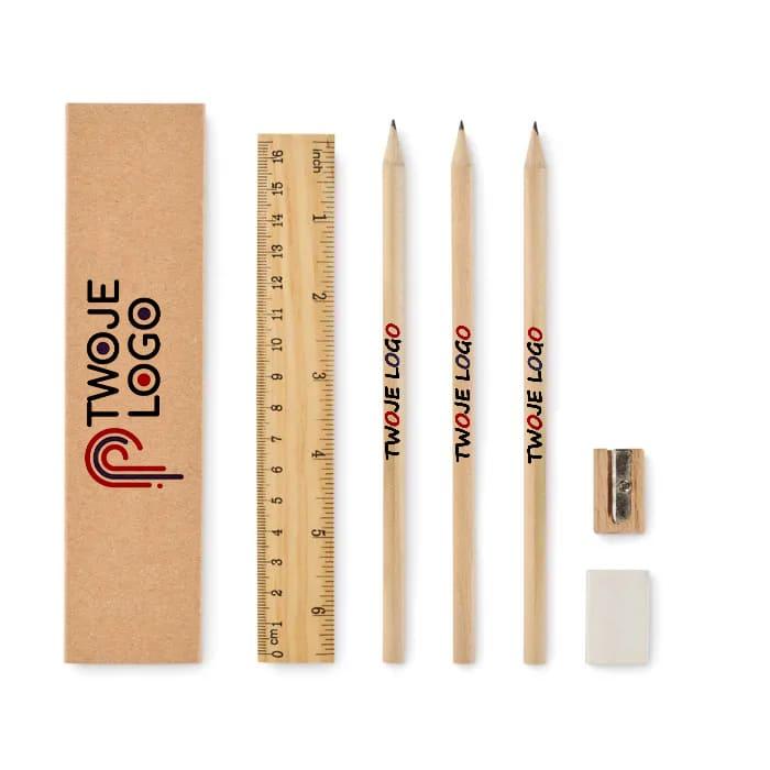 Pudełko papierowe z 3 naostrzonymi ołówkami, 1 drewnianą temperówką, 1 gumką i 1 drewnianą linijką.