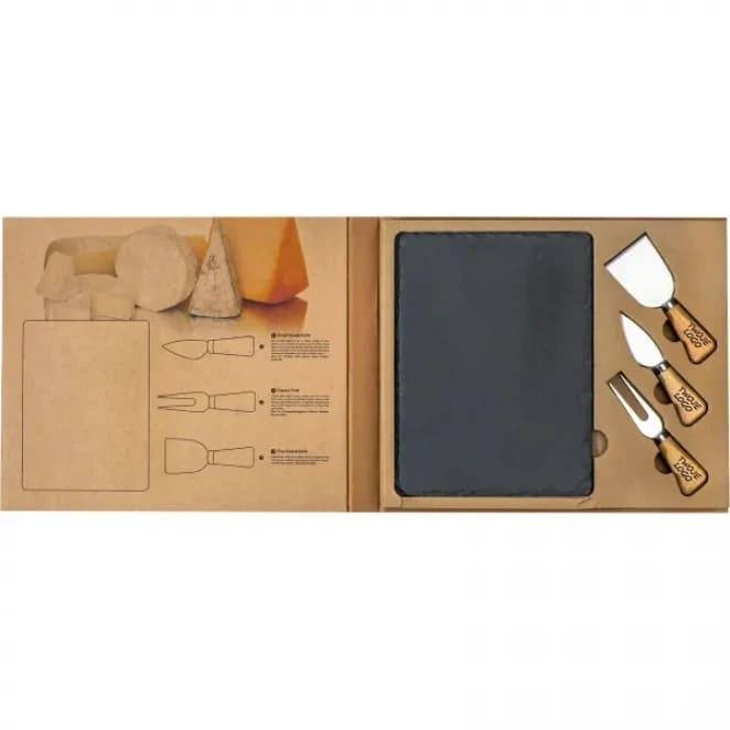 Zestaw zapakowany w solidne kartonowe pudełko. W środku znajduje się deska z łupka i zestaw 3 sztućców do sera.