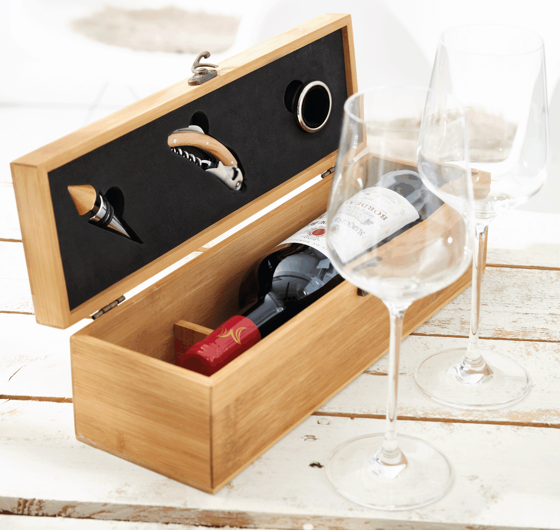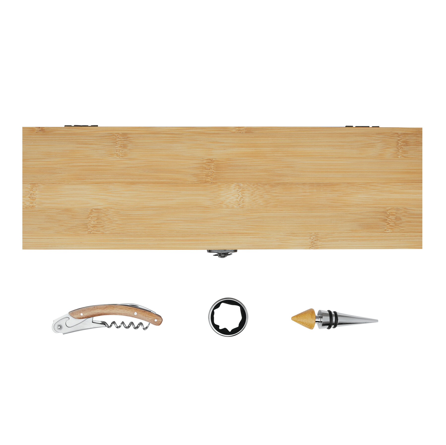 Zestaw do wina BAMBOO PRECIOUS na 1 butelkę. Składa się z okapnika ze stali nierdzewnej, korka z drewniana zatyczką oraz noża kelnerskiego ze stali nierdzewnej z drewnianym uchwytem. Całość w bambusowej skrzynce.