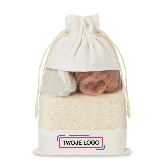 Zestaw do kąpieli zawierający gąbkę, pumeks i myjkę, zapakowany w woreczek bawełniany z okienkiem PEVA.