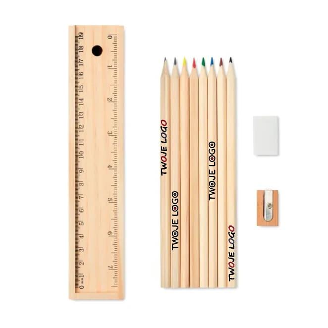 Zestaw zawiera 6 kredek, 2 ołówki, 1 temperówkę, 1 gumkę oraz linijkę służącą jako pokrywka do drewnianego piórnika.