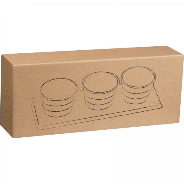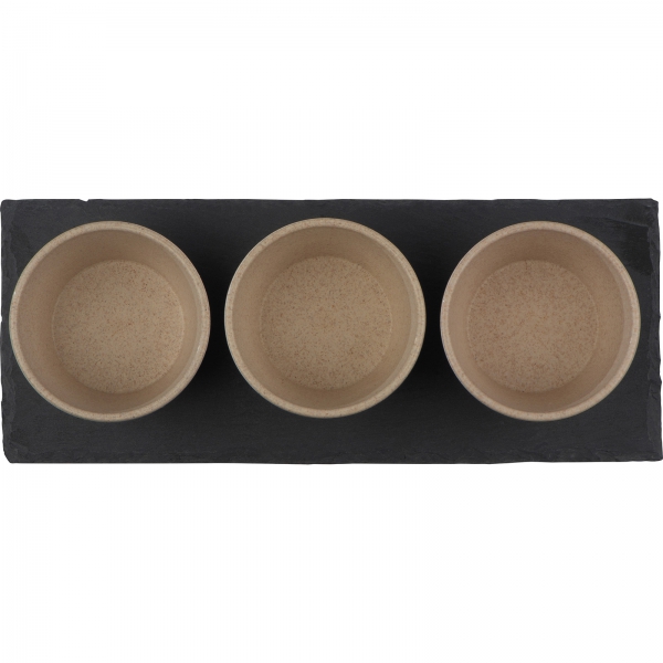 Zestaw składający się z trzech miseczek z bambusa i PP oraz łupkowej podstawki.