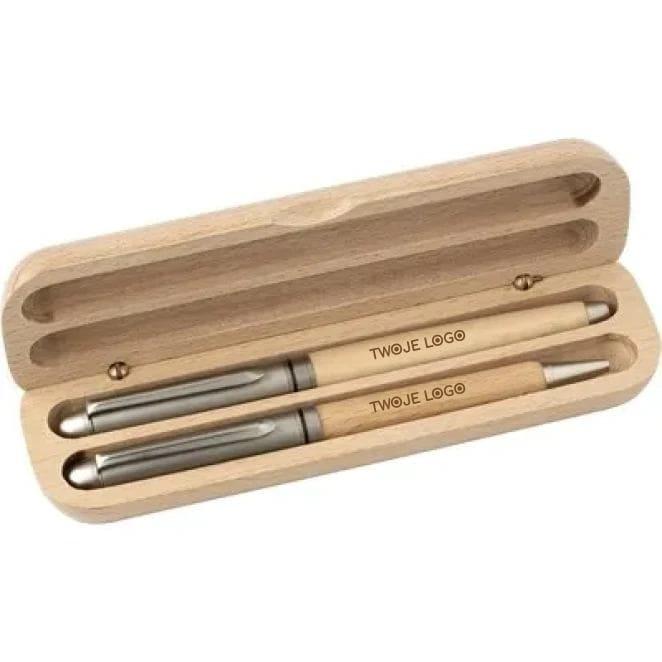 Zestaw piśmienniczy w etui z drewna bukowego, długopis i pióro kulkowe z metalowymi elementami, niemiecki wkład Dokumental®