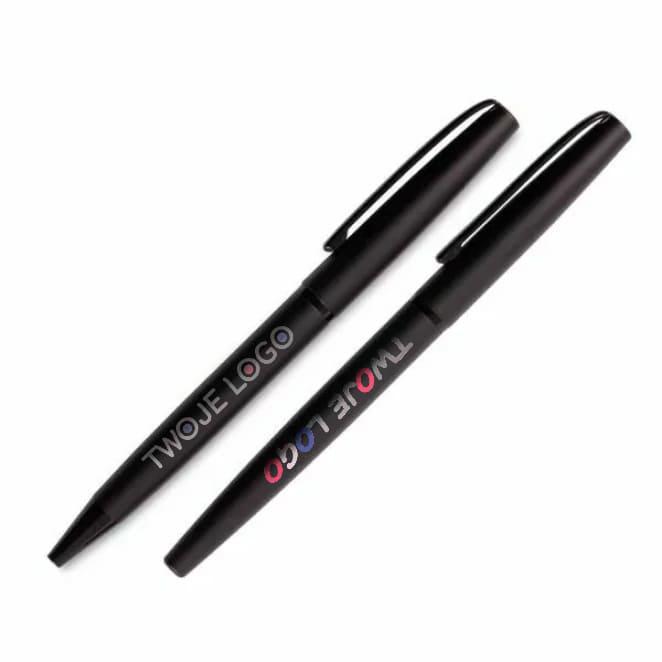 Zestaw piśmienniczy składający się z metalowego pióra kulkowego i długopisu. Wkład w kolorze niebieskim. Pakowany w upominkowe opakowanie.