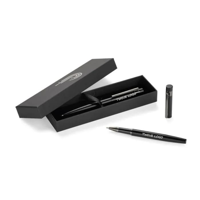 Zestaw piśmienniczy ZILE w etui zawiera metalowy długopis i pióro kulkowe o nowoczesnym wykończeniu. Całość uzupełnia elegancki, ciemnoszary klips, który nadaje zestawowi profesjonalny charakter. Doskonały wybór na biznesowy upominek.