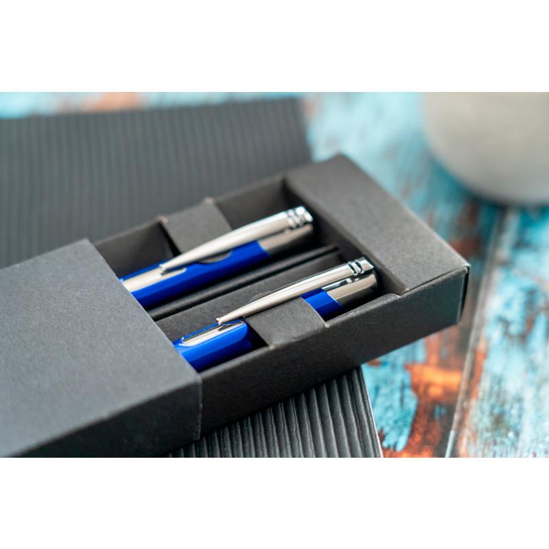 Metalowy Zestaw piśmienniczy składający się z długopisu z dużym,niebieskim wkładem oraz ołówkiem automatycznym. Całość umieszczona w etui. Dostępny w kilku kolorach.