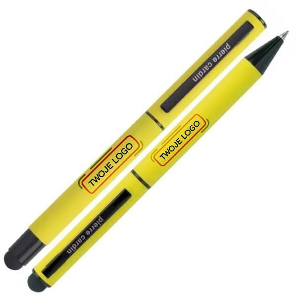 Zestaw piśmienniczy w modnych, intensywnych kolorach, składający się z długopisu oraz pióra kulkowego. Obydwa artykuły posiadają przyjemną w dotyku powierzchnię soft touch i czarne detale oraz funkcję touch pen. Długopis wyposażony w niebieski wkład (0,7 mm), a pióro kulkowe w niemiecki wkład Schneider piszący na niebiesko (0,5 mm). Całość zapakowana w eleganckie etui prezentowe z certyfikatem autentyczności Pierre Cardin.