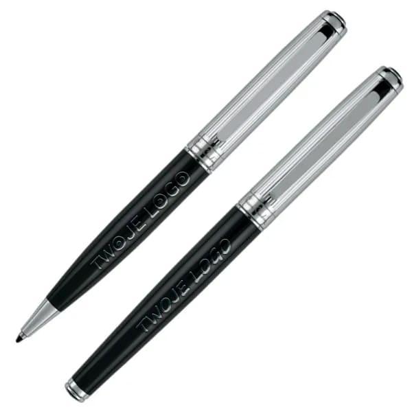 Elegancki Zestaw piśmienniczy składający się z długopisu i pióra kulkowego. Korpusy wykonano z czarnego, lakierowanego metalu i wzbogacono o srebrne detale. Obydwa artykuły posiadają wysokiej jakości wkłady piszące na niebiesko (długopis 1 mm, pióro kulkowe 0,6 mm) oraz zapasowe wkłady piszące na czarno. Całość zapakowana w eleganckie pudełko prezentowe z certyfikatem autentyczności Pierre Cardin.