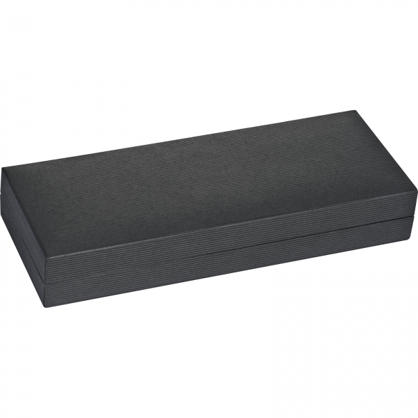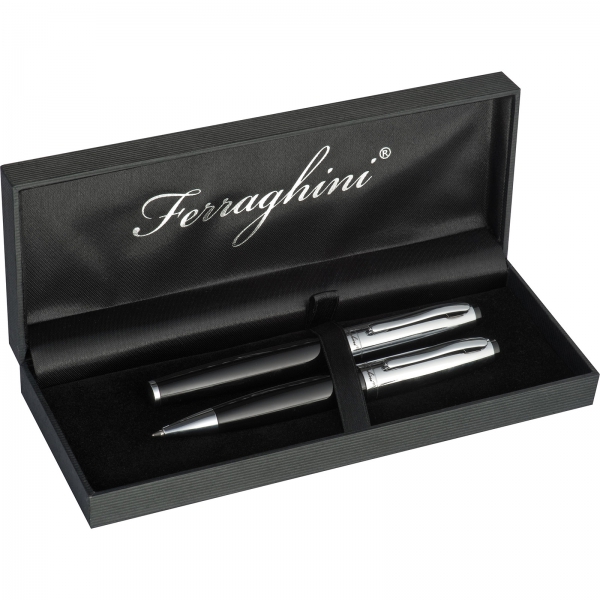 Klasyczny zestaw piśmienniczy marki Ferraghini, w którego skład wchodzą długopis i pióro kulkowe w eleganckim, czarnym etui.