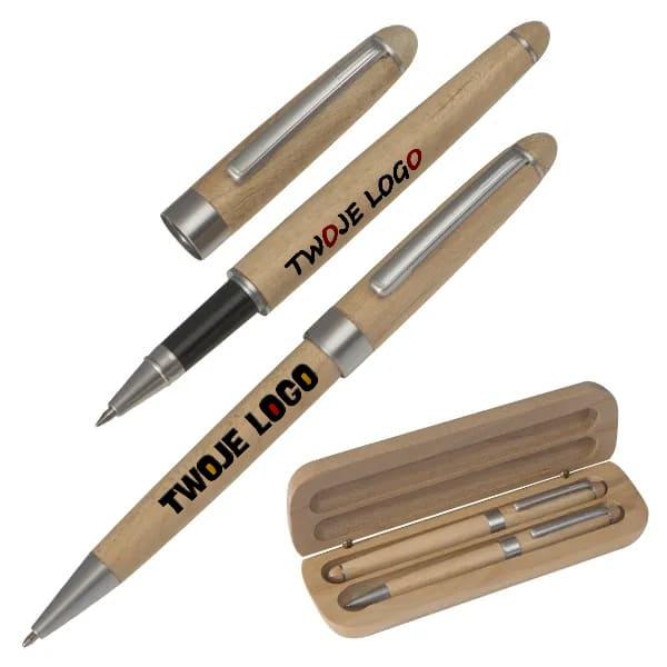 Zestaw piśmienniczy wykonany z drewna z metalowymi wkładami, piszącymi na niebiesko. Długopis z mechanizmem obrotowym.