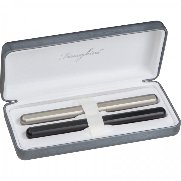 Nowoczesny zestaw do pisania od Ferraghini. Wewnątrz etui znajduje się pióro wieczne oraz pióro kulkowe wykonane z aluminium.