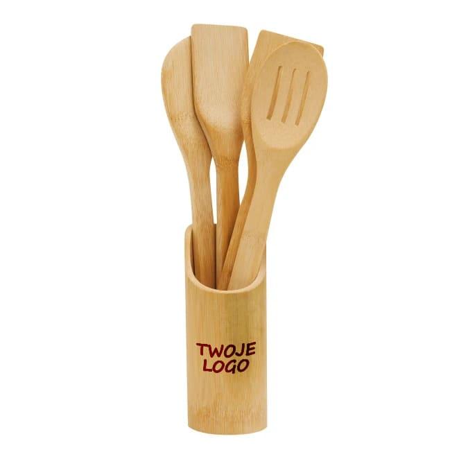 Zestaw przyborów kuchennych COOKING TIME. Składa się z 5 bambusowych elementów: łyżki, szpatułek i pojemnika.