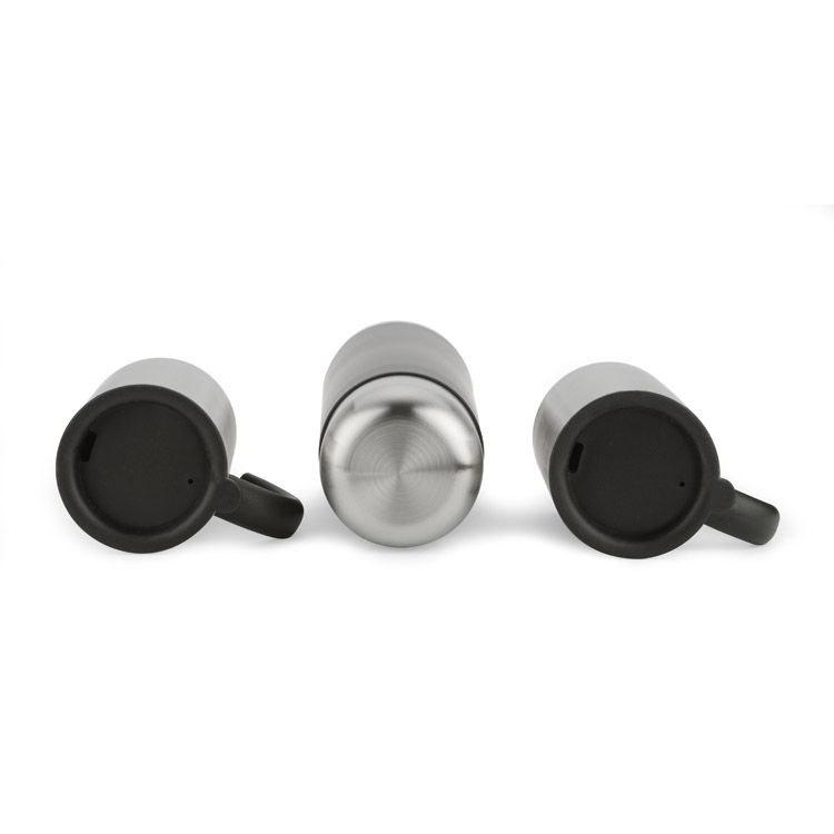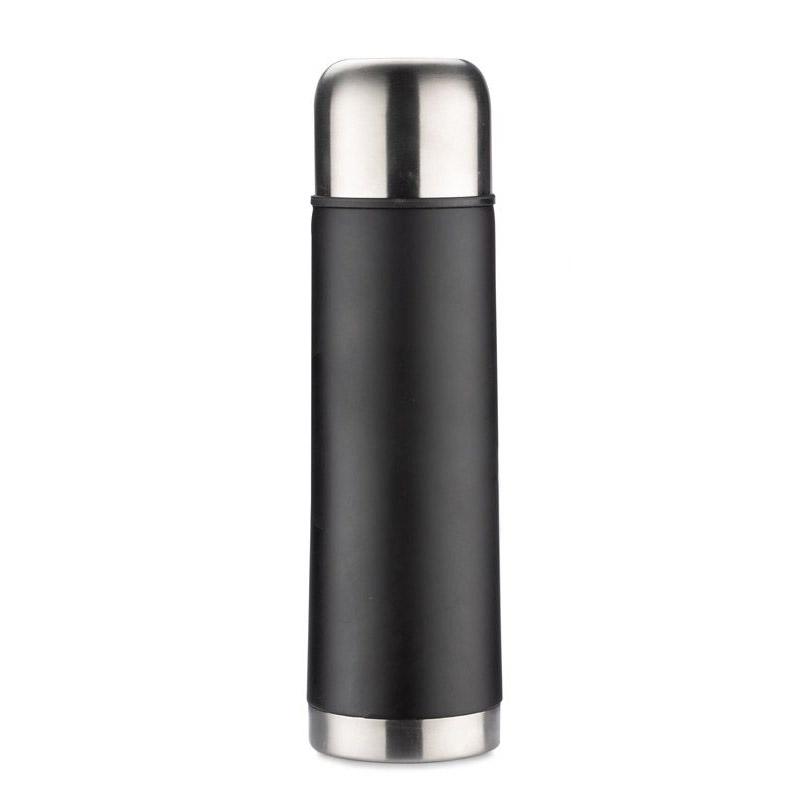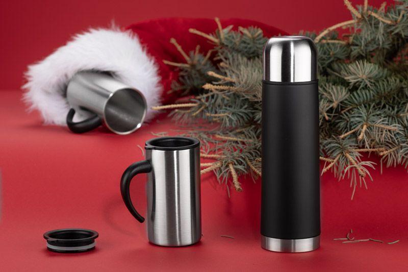 Termos ze stali nierdzewnej o pojemności 500 ml wraz z nakrętką-kubeczkiem o pojemności 90 ml oraz dwa kubki termiczne o pojemności 260 ml. Zestaw niezbędny w każdej podróży, pakowany jest w czarny kartonik. Logo grawerujemy na powierzchni kubków i termosów.