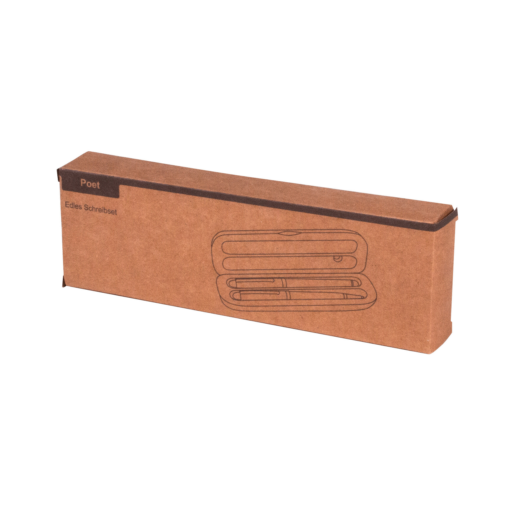 Zestaw z drewna różanego POET składa się z pióra wiecznego i długopisu (niebieski tusz) w etui. Całość z drewna różanego ze złotymi akcentami.