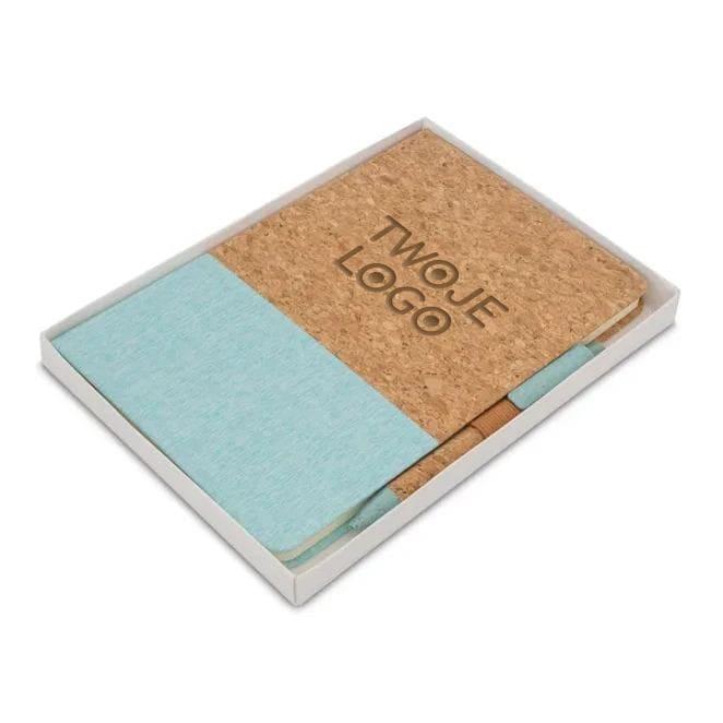 Elegancki notes łączący naturalny korek z płótnem. Rozmiar A5, 80 kartek w linie (gramatura 70 g/m2). Wyposażony w długopis wykonany z korka, słomy pszennej i PP. Pakowany w pudełko.