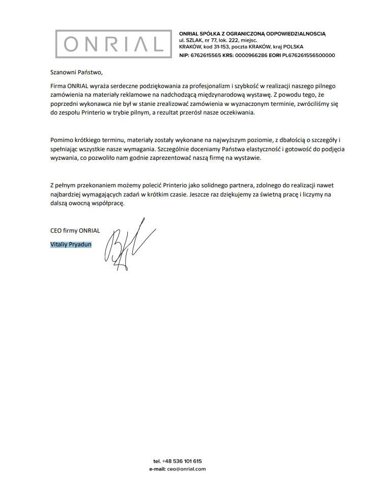 Firma ONRIAL wyraża serdeczne podziękowania za profesjonalizm i szybkość w realizacji naszego pilnego zamówienia na materiały reklamowe na nadchodzącą międzynarodową wystawę. Z powodu tego, że poprzedni wykonawca nie był w stanie zrealizować zamówienia w wyznaczonym terminie, zwróciliśmy się do zespołu Printerio w trybie pilnym, a rezultat przerósł nasze oczekiwania.