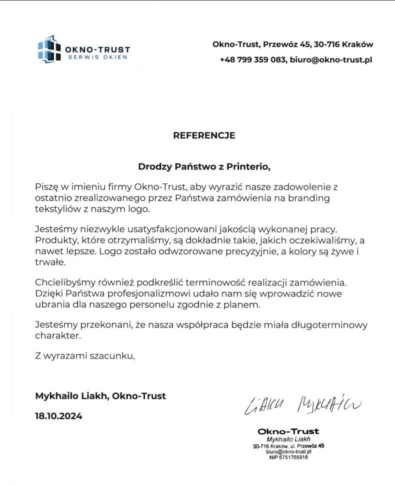 Piszę w imieniu firmy Okno-Trust, aby wyrazić nasze zadowolenie z ostatnio zrealizowanego przez Państwa zamówienia na branding tekstyliów z naszym logo.