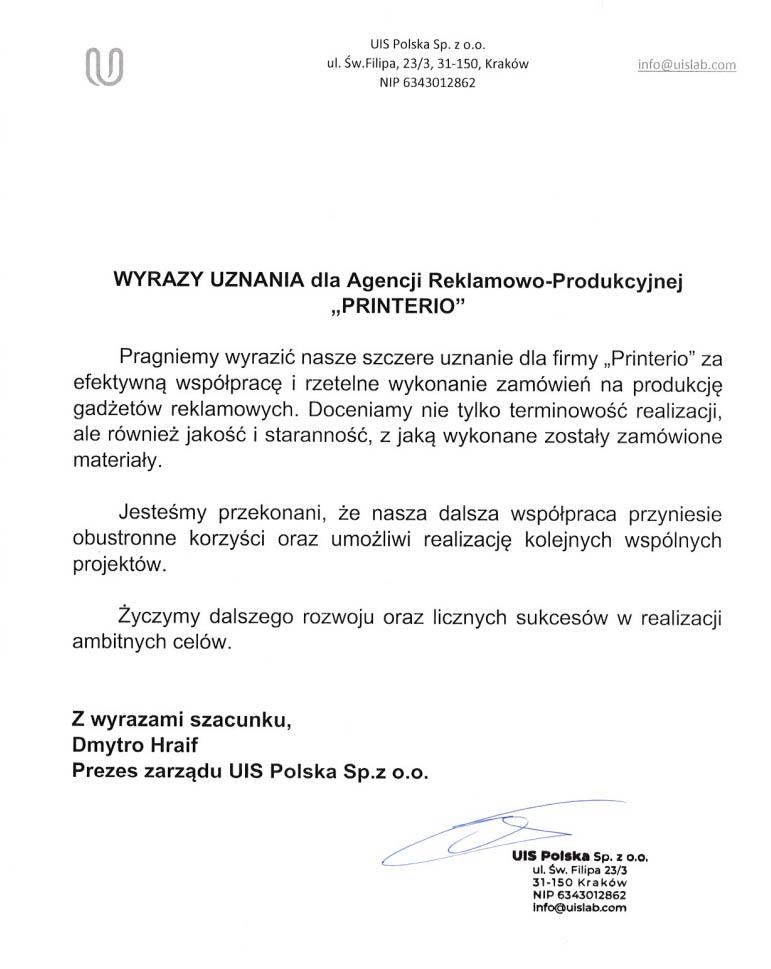 W trakcie długotrwałej współpracy daliście się poznać jako niezawodny partner. Uważamy za zasadne polecać firmę ,,Printerio” jako wykwalifikowaną i kompetentną organizację w realizacji podobnych zadań.