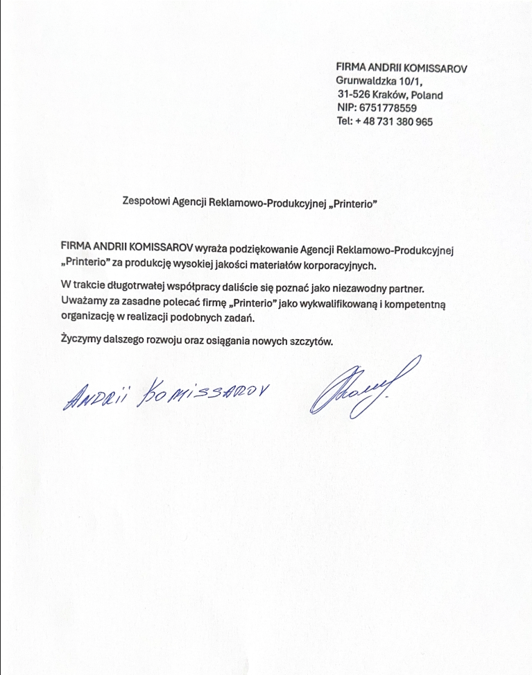 FIRMA ANDRII KOMISSAROV wyraża podziękowanie Agencji Reklamowo-Produkcyjnej "Printerio” za produkcję wysokiej jakości materiałów korporacyjnych.